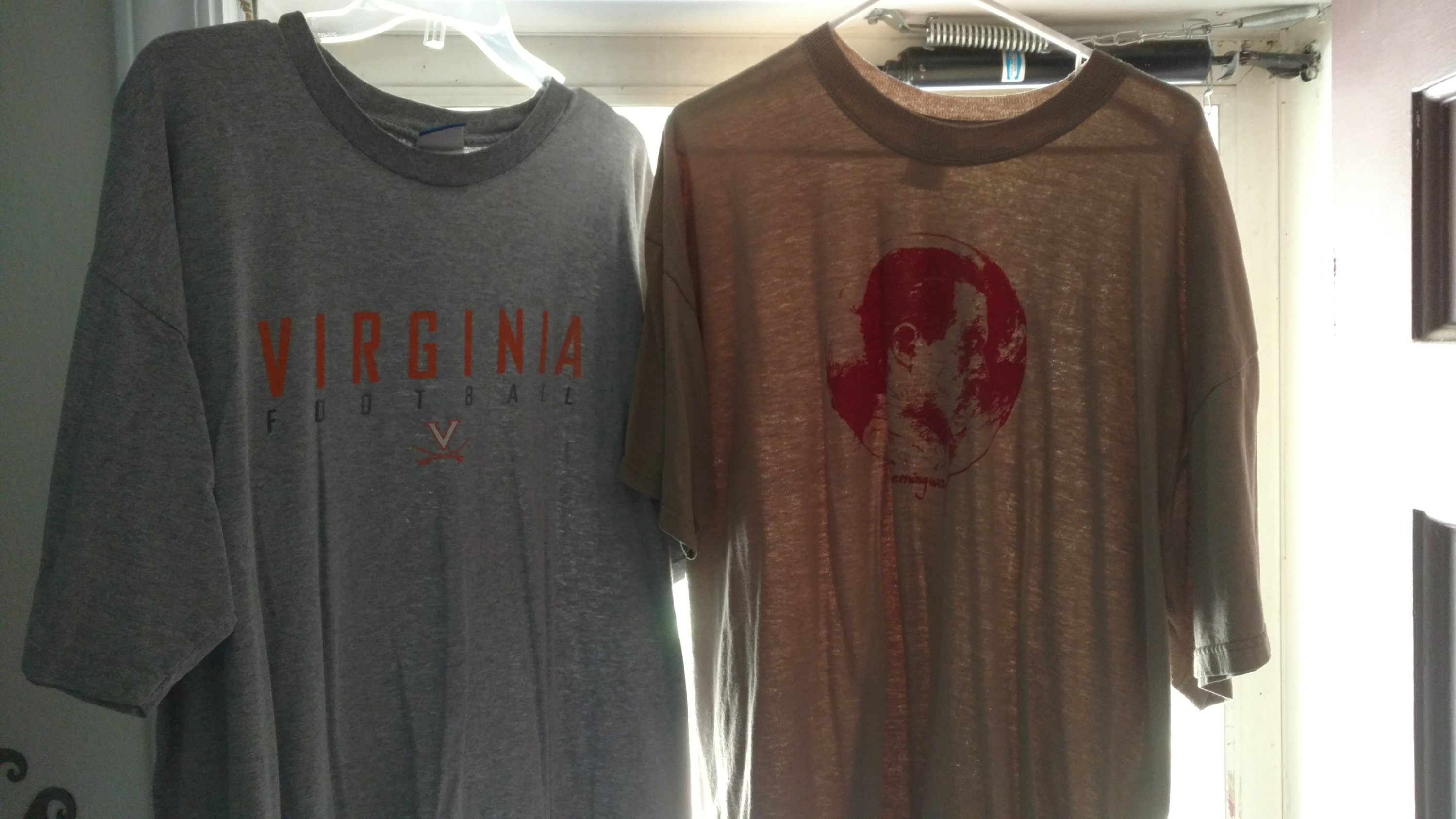 An old Virginia shirt that has seen a decade and a half or so of my follies, and a Hemingway shirt I got off eBay a while back (at least 12 years). Both are attached to a lot, but really so little.