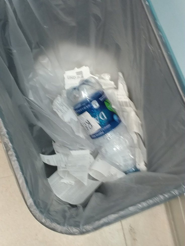I tossed this on my last day at my retail job. Dasani water bottle with name tag would be the title in art gallery.
